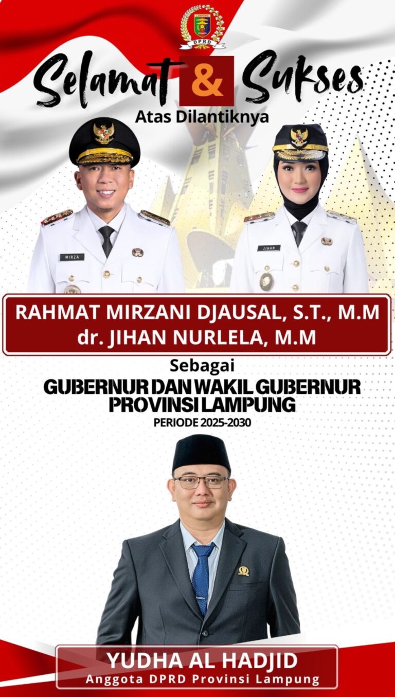 “Selamat bertugas, kepada Gubernur – Wakil Gubernur Lampung, Mirza – Jihan. Semoga, dapat amanah dalam membangun provinsi Lampung lebih baik,” kata Anggota Fraksi NasDem DPRD Lampung, Yudha Alhadjid.