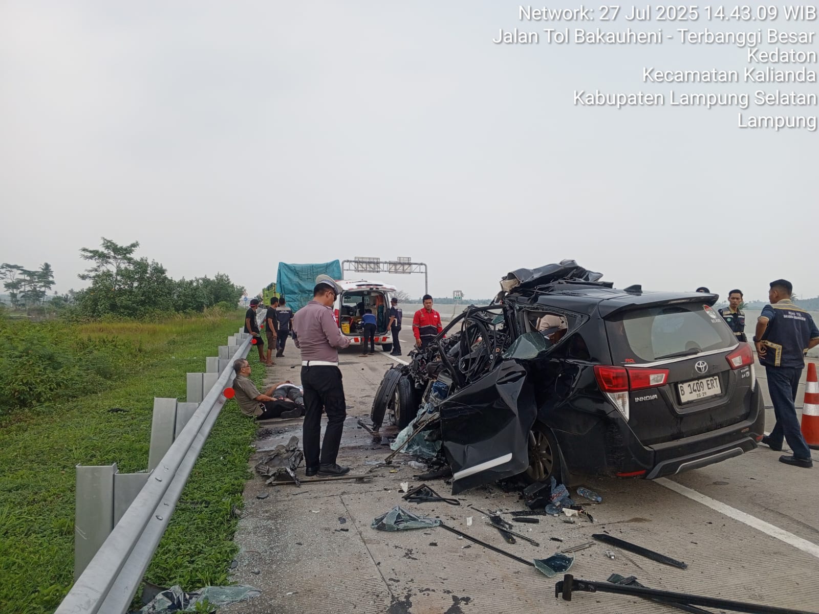 Lampung – Kecelakaan lalu lintas tragis terjadi di Jalan Tol Trans Sumatera (JTTS) Ruas Bakauheni–Terbanggi Besar, tepatnya di KM 38+200 Jalur B, wilayah hukum Polres Lampung Selatan, pada Minggu (27/7/2025) pukul 14.25 WIB.